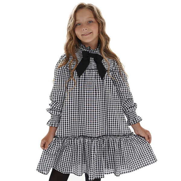 Оригинальное платье с длинным рукавом понравится любой девочке дошкольного возраста. Модель создана по классическому шаблону. Завышенная линия талии обеспечивает свободу движений и удачную посадку на фигуре любого типа. Строгий воротничок в форме стойки смягчают изящные оборки на рукавах и в нижней части. Украшением служит лаконичный бант, идеально подходящий к общей цветовой гамме. Застежка на спинке упрощает процесс переодевания.