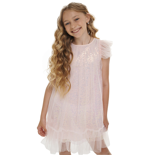 Это нарядное платье в розовом цвете – идеальный вариант для торжественных событий. Состоит из блестящей основы, украшенной розовыми переливающимися пайетками и легкого полупрозрачного верхнего слоя. Сочетание разных текстур и видов ткани делают эту модель еще более необычной и оригинальной. Примерив его, девочка почувствует себя героиней сказки.