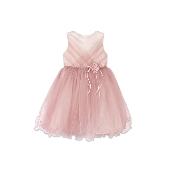 Нарядное розовое платье с пышной полупрозрачной юбкой. Модель легкая и воздушная, с коротким рукавом. В качестве декоративного элемента на поясе пришит небольшой цветок. В таком наряде малышка будет чувствовать себя настоящей принцессой на любом празднике. Платье можно надеть на утренник, Новый год или другое торжественное событие.