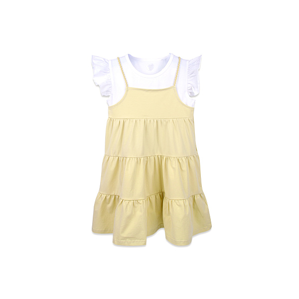 Нарядное детское платье выполнено в популярном молодежном стиле харадзюку. Фасон изделия выглядит так, как будто сарафан одет на фуфайку. Особенностью стиля является использование многослойности в одежде, сочетание различных фактур. Необычные гофрированные рукавчики прекрасно дополняют юбку, сформированную из нескольких рядов присборенной ткани. Нежное цветовое сочетание и легкий трикотаж делают платье отличным вариантом для прогулок в теплую погоду или посещения детского заведения. Высокое содержание хлопка в составе ткани позволяет коже малышей оставаться здоровой и ухоженной.