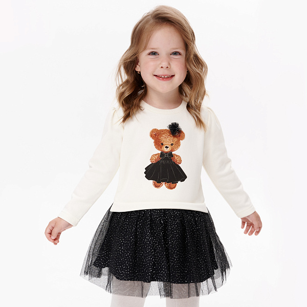 Платье с фатиновой юбкой станет отличным выбором для маленьких модниц. Верх модели выполнен из мягкого дышащего материала: 80% хлопка и 20% полиэстера. Такая комбинация обеспечивает комфорт и хорошую вентиляцию, не вызывая раздражений на коже. Передняя часть платья украшена милым изображением мишки в черном платье.
