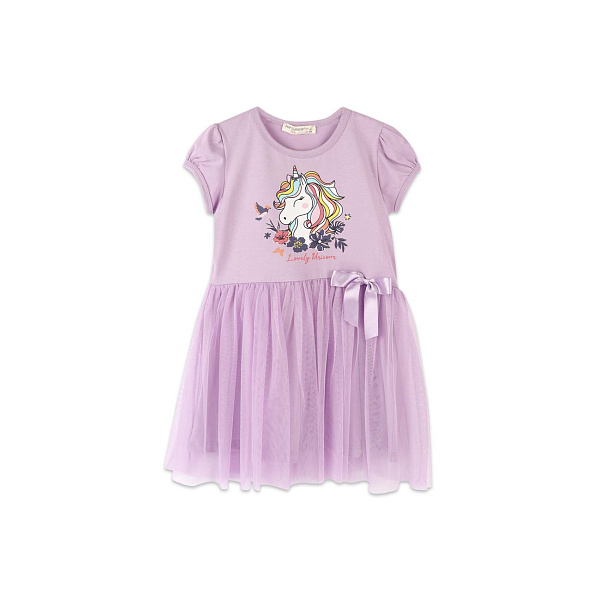 Платье Lovely Unicorn принт единорог в цветах с бантом на поясе фиолетовое