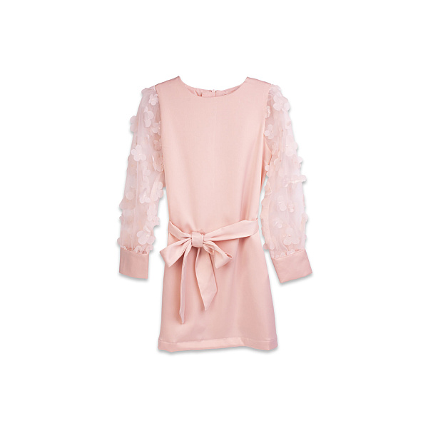 Стильная модель платья будет одобрена каждой девочкой дошкольного возраста и гармонично впишется в ее гардероб. Строгий прямой силуэт чудесно дополняют прозрачные рукава с высокими манжетами. На них есть двойная застежка в виде сияющих пуговиц. Широкий пояс позволит подогнать платье по фигуре и отрегулировать объем в области талии, но при этом изделие не сковывает движений.