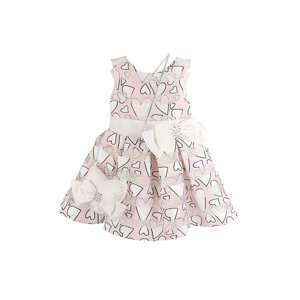Платье с двойным бантом со стразами и сумкой принт сердечки бело-розовое