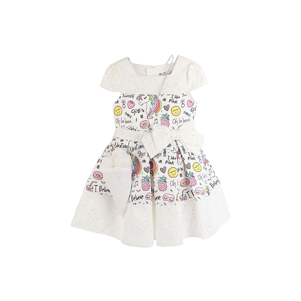 Платье с аксессуаром (сумкой) с первой же минуты очарует маленькую модницу, вызовет у нее восторг. Вещь с милым волшебным принтом выглядит стильно и актуально для фэнтезийной детской моды.