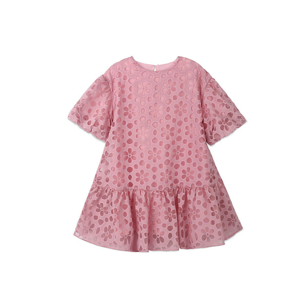Платье свободного кроя понравится любой девочке дошкольного возраста. Модель с короткими объемными рукавами украшена широкой оборкой. Наряд не сковывает движения, хорошо сидит на фигуре любого типа, подчеркивает нежный образ юной модницы. На спинке предусмотрена застежка. Ажурный верхний слой придает изделию эксклюзивный внешний вид.