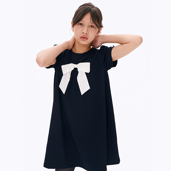 Школьное платье с бантом понравится любой девочке-школьнице. Оно выполнено в темно-синем цвете с белым бантом на груди. Фасон платья — трапеция — обеспечивает удобство для энергичных детей. В нем нежарко и комфортно как сидеть на уроках, так и передвигаться в течение всего дня.