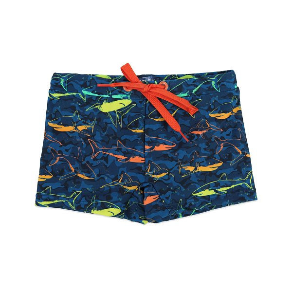 Ткань темно-синего цвета украшена изображениями морских волн и разноцветных хищных акул. Ребенок будет в восторге от такого рисунка на плавках, и обязательно захочет научиться плавать не хуже, чем эти быстрые и ловкие морские хищники. На поясе плавок есть кулиска со шнурком красного цвета. С его помощью легко подтянуть пояс по размеру талии ребенка, например если плавки были приобретены на вырост.