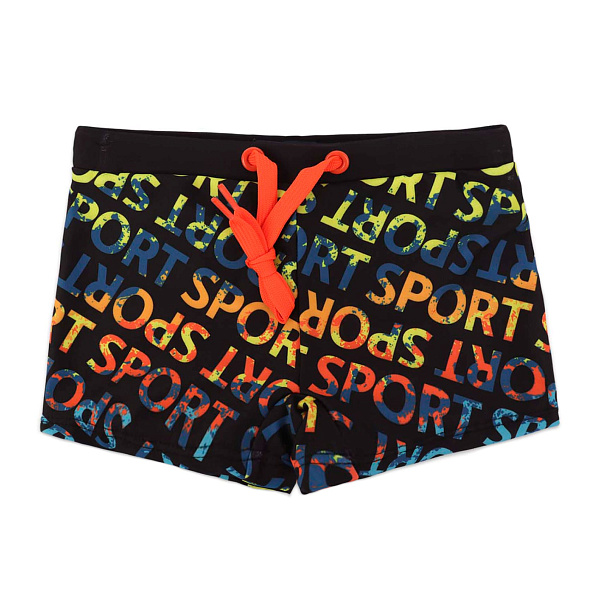 Удобные и эластичные плавки займут достойное место в пляжном гардеробе мальчика. Ребёнку понравятся оригинальные рисунки в виде яркого текстового принта по всей плоскости изделия на черном фоне.