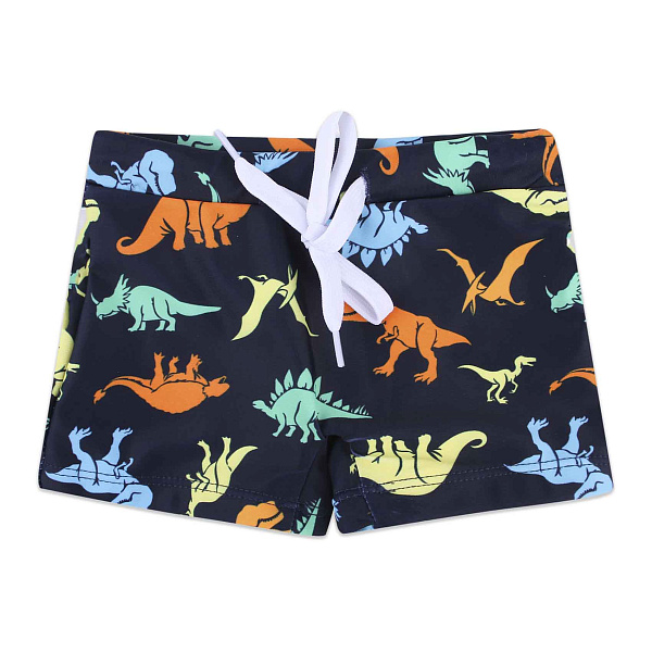 Плавки-боксеры для мальчиков выполнены в ярком дизайне с красочными изображениями динозавров на темно-синем фоне. Такой принт добавляет изделию игривость и привлекает внимание, подчеркивая индивидуальность маленького купальщика.