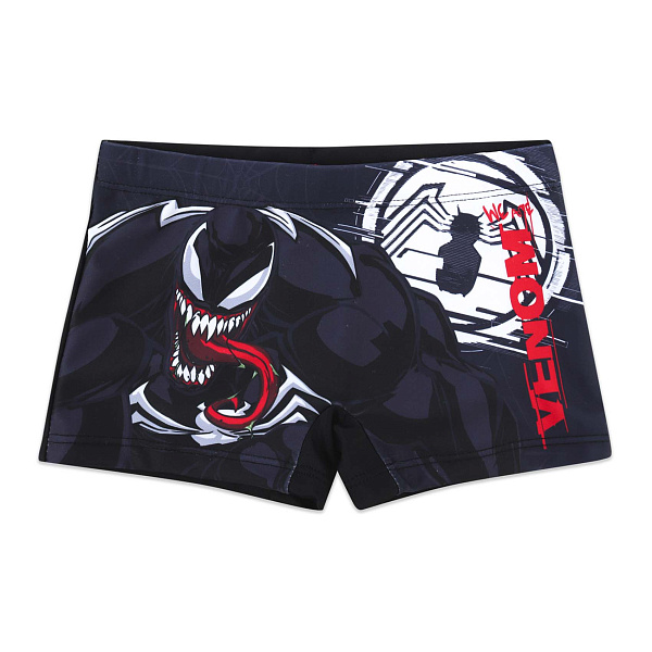 Купальные плавки для мальчиков с изображением супергероя. Изделие выполнено в виде обтягивающих шорт. На поясе вшита широкая и мягкая резинка, не дающая одежде сползти, при этом не сдавливающая и не мешающая кровотоку. Плавки черного цвета. На них нарисован популярный и любимый многими мальчишками персонаж Веном. Такой дизайн точно оценят маленькие фанаты популярной киновселенной Марвел.