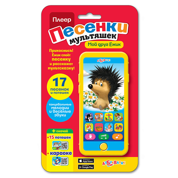 Чудесный развивающий плеер для малышей с большим набором песен из популярных детских мультфильмов, а также потешек. Небольшой гаджет размерами напоминает взрослый смартфон, что позволит отвлечь внимание ребенка от телефонов родителей. В арсенале плеера 17 развлекательных мелодий, под которые малыш сможет танцевать и подпевать исполнителям, развивая чувство ритма, музыкальный слух и память.