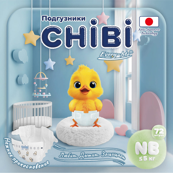Подгузники EVERY-ME CHIBI NB созданы специально для новорожденных весом до 5 кг. В упаковке – 72 подгузника, что позволит запастись надолго. Особый вырез для пупка не мешает заживлению и обеспечивает удобство использования с первых дней жизни малыша. Японская система впитывания DRY FLOW быстро распределяет влагу и удерживает ее до 12 часов, предотвращая комкование наполнителя.