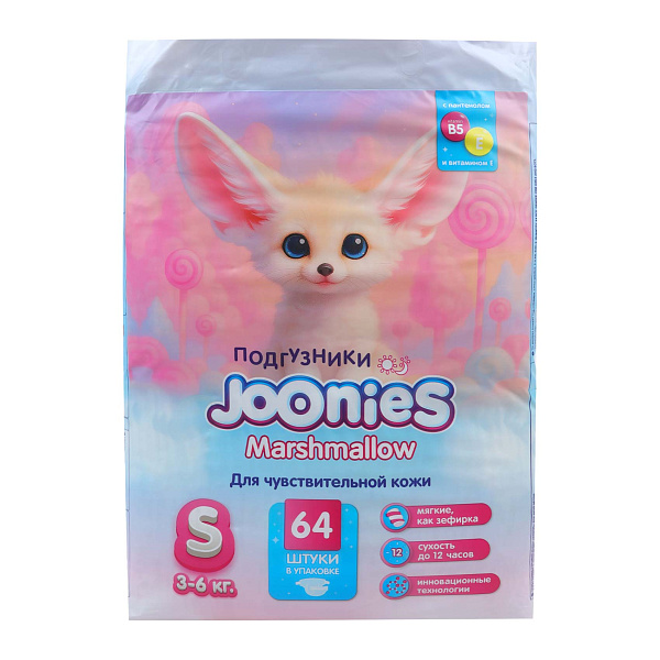 Подгузники JOONIES Marshmallow S для чувствительной кожи 3-6кг 64шт