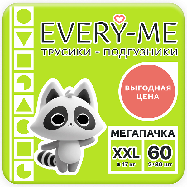 Подгузники-трусики Every-Me размер XXL предназначены для детей весом от 17 кг. Анатомическая Q-форма подходит как мальчикам, так и девочкам. Трусики имеют дышащую внешнюю поверхность, что способствует прохождению воздуха и выводу влаги наружу. Для удобства смены предусмотрены швы, которые рвутся по необходимости.