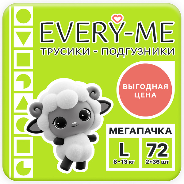 Подгузники-трусики Every-Me размера L подходят для детей весом от 8 до 13 кг. В упаковке находится 72 штуки, что удобно для длительного использования. Трусики имеют анатомическую форму, которая подходит мальчикам и девочкам. Внутренний 3D-слой быстро впитывает влагу и распределяет ее равномерно за счет дополнительного слоя целлюлозы. Дышащая поверхность пропускает свежий воздух внутрь и выпускает влагу наружу.
