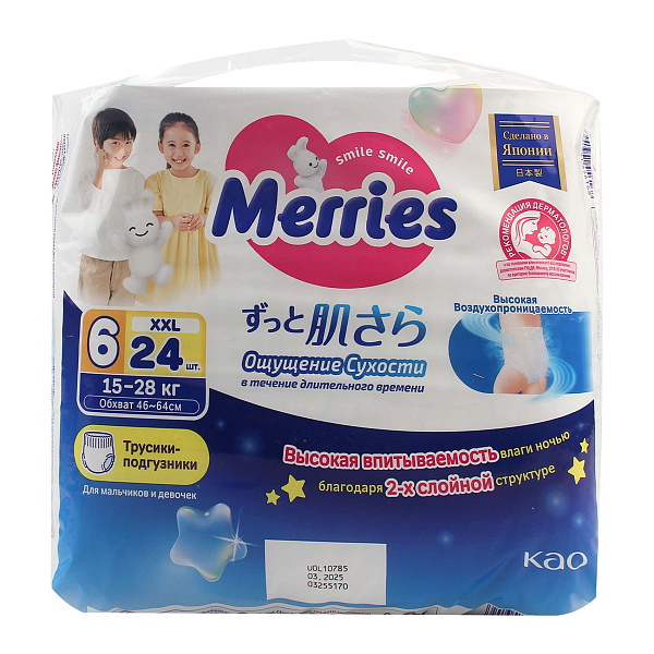 Трусики Merries XXL (15-28 кг) в упаковке 26 штук созданы для спокойного сна и активного дня ребенка. Два впитывающих слоя быстро поглощают влагу, предотвращая протекания даже при активных движениях малыша ночью. Трусики плотно облегают, не сдавливая и не оставляя следов, благодаря особому крою и мягкой эластичной резинке, которая легко растягивается в 2,5 раза. Такой подход уменьшает дискомфорт и помогает избежать раздражений на коже.