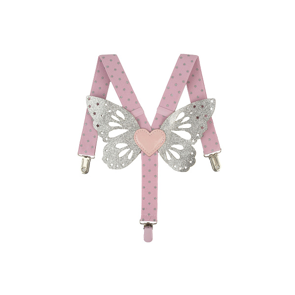 Подтяжки рассчитаны на девочку старше 3 лет. По росту регулировка осуществляется при помощи бегунков. Точка соединения резинок оформлена из лаковой кожи в виде сердечка, к которому прикреплены серебристые блестящие крылья бабочки. Сами же крылья украшены ажурными узорами.