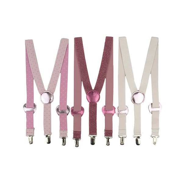 Особенностью этой модели подтяжек являются декоративные регуляторы, которые позволяют регулировать длину резинок-лямок по росту ребенка. Они представляют собой сердца, украшенные прозрачными крупными стразами. Регуляторы металлические, окрашены в цвет подтяжек. Фиксаторы выполнены из металла в серебряном цвете. Точка соединения резинок оформлена искусственной кожей в перламутровом оттенке в цвет подтяжек.