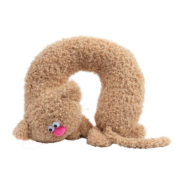 Дорожная подушка-игрушка выполнена в форме кота. Размер изделия составляет 30 сантиметров. Основной цвет — бежевый. Наполнитель — синтепон. Чехол сшит из текстиля с меховой текстурой.