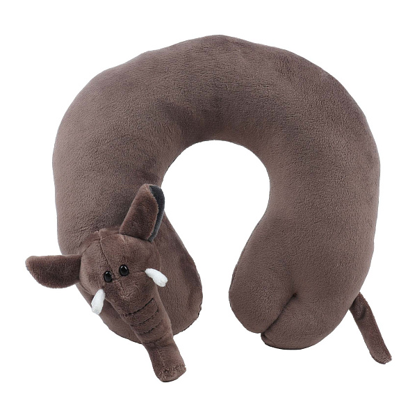 Дорожная подушка-игрушка выполнена в форме слоненка. Диаметр изделия составляет 30 сантиметров. Наполнитель — синтепон. Чехол сшит из мягкого текстиля.