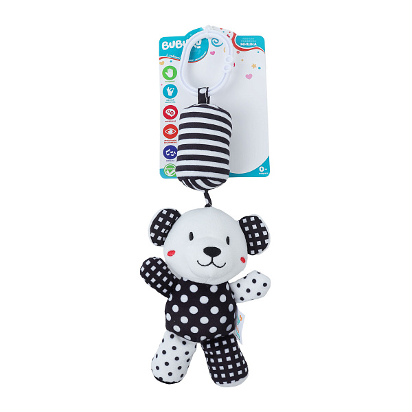Мягкая подвеска «Мишка» — развивающая игрушка для малышей от рождения, выполненная из высококачественных тканей с мягким наполнителем. Черно-белые разнофактурные ткани и привлекают внимание ребёнка, стимулируют его двигательную активность и ощущения.