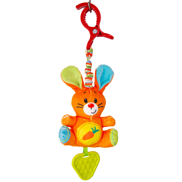 В процессе игры с подвесной малыш разовьет мелкую моторику рук, зрительное восприятие, осязание и интеллект. Дополняет образ милого зайки грызунок, который выполнен из эластичного материала и не вредит нежным деснам в период роста зубов. Прорезыватель из безопасного пластика отвлечет малыша от неприятных ощущений. В верхней части игрушки имеется фиксатор, благодаря которому ее можно повесить на коляске, люльке или дуге развивающего коврика. Товар подойдет детям с первых дней жизни.