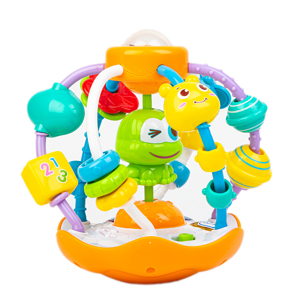 Погремушка «Лягушонок» предназначена для детей старше 3 лет. Это развивающая игрушка в виде цветочка, на котором сидит симпатичный лягушонок из пластика. Конструкция погремушки состоит из основания и нескольких изогнутых дуг с рельефной поверхностью, на которые нанизаны подвижные детали. Трогая их, малыш научится отличать на ощупь разные фактуры. Играя с развивающей игрушкой, он будет постепенно узнавать названия новых форм, цветов и развивать моторику рук. Погремушка работает от батареек, и при нажатии на кнопки она издает забавные звуки.