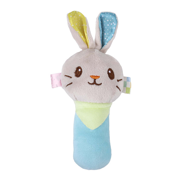 Погремушка-пищалка в виде зайчика выполнена в нежных пастельных тонах, что делает ее визуально привлекательной для малышей. Мягкие текстуры материала обеспечивают приятные тактильные ощущения, способствуя развитию сенсорных навыков.