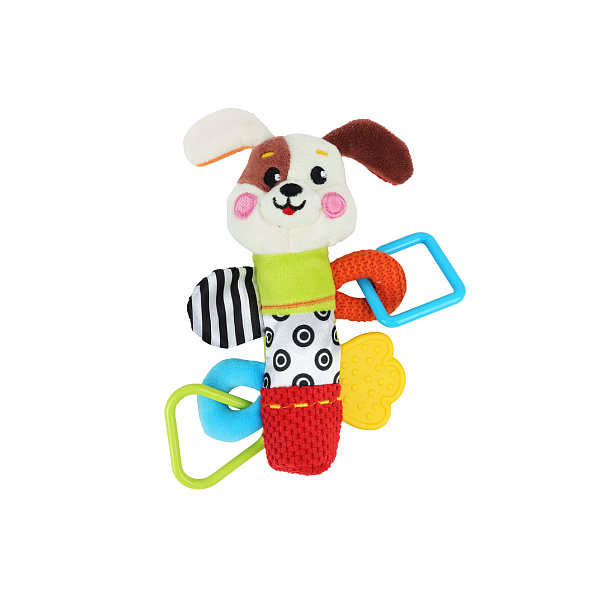 Забавный щенок станет верным другом для малыша и хорошим помощником для мамы. Мягкая игрушка пошита в виде щенка, и не простого – а пищащего! Малыш может сжимать игрушку ручкой и слушать веселый писк. Чем сильнее он сдавит, тем громче будет звук. Разная фактура игрушки (мягкая шерстка, вязаные и шуршащие лапки) положительно повлияют на сенсорику и тактильные ощущения. На игрушке малыш найдет пластиковые фигурные колечки и прорезыватель из мягкого упругого силикона, он поможет в период роста зубов и снимет зуд. Рекомендовано для детей с первых дней жизни. Высота игрушки 23см.