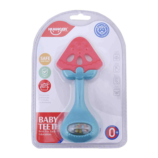 В верхней части, выполненной из мягкого силикона, расположен прорезыватель, предназначенный для массажа и облегчения боли при прорезывании зубов. В основании встроена погремушка с разноцветными шариками, которые при встряхивании издают приятный звук, стимулируя слуховое восприятие ребенка.
