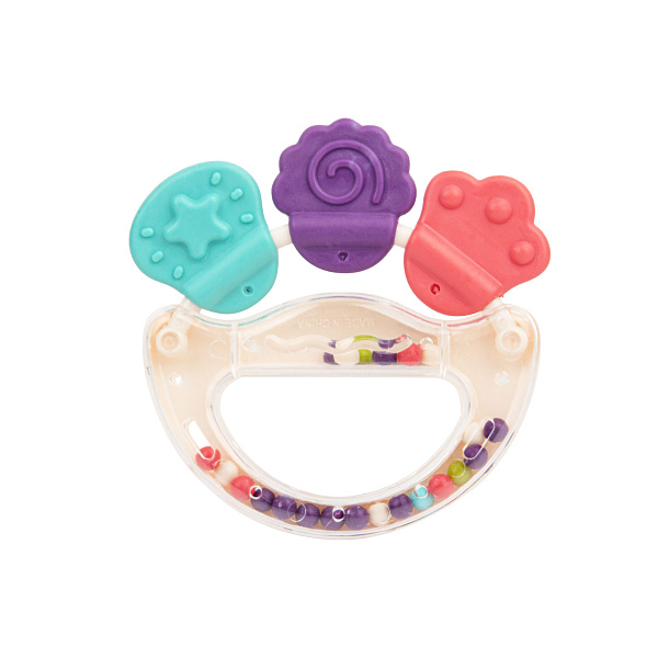 Звонкая погремушка с полупрозрачным корпусом предназначена для малышей с трехмесячного возраста. Внимание ребенка привлечет яркий цвет и звук, а также подвижные шарики внутри ручки. Три подвижных элемента из упругого силикона предназначены на прорезывания зубов, ведь их так приятно грызть, массируя распухшие десны. Изделие обтекаемой формы не травмирует малыша, но подарит немало эмоций.