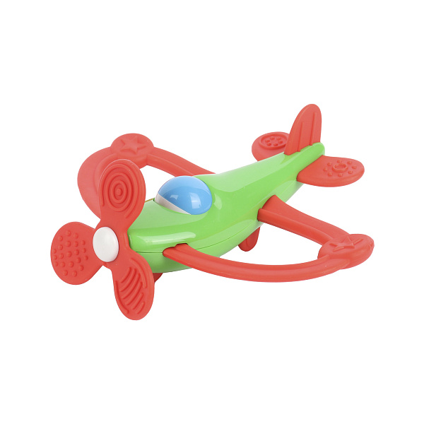Погремушка-прорезыватель в виде яркого самолета понравится мальчику старше 3 месяцев. Она привлекает внимание мелодичным звоном, имеет подвижный пропеллер. Выступающие части можно грызть, чтобы снять зуд с распухших десен.