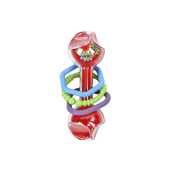 Яркая погремушка порадует каждого маленького исследователя. Игрушка изготовлена из прочного гладкого пластика. Основание погремушки выполнено в форме гантели с наполовину прозрачным корпусом, внутри которого перекатываются разноцветные шарики и во время тряски издают звонкое шуршание, по громкости не превышает 60 децибел. Три нанизанных разноцветных кольца познакомят малыша с новыми цветами и формами. Красочная погремушка развивает моторику рук, сенсорику, зрение и слух. Рекомендовано для детей с первых дней жизни.