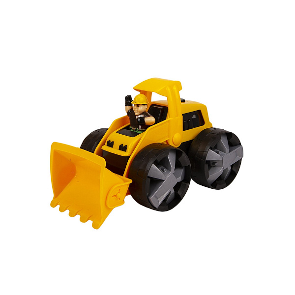 Эта игрушка выполнена из прочного пластика и не сдержит мелких деталей, поэтому безопасна для малыша. У экскаватора присутствуют подвижные массивные колеса и ярко-желтый ковш, а фигурку рабочего можно достать и использовать как отдельную игрушку.