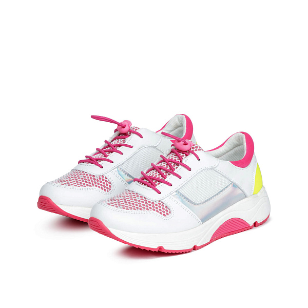 Белые кроссовки из кожи для девочек дошкольного возраста декорированы цветным вставками розового, желтого и перламутрового цвета. Толстая рельефная подошва слегка приподнята к пятке, а внутрь стельки вложена специальная подушка, поэтому нагрузка на стопу ребенка при ходьбе будет распределяться равномерно.