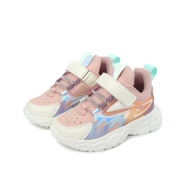 Нарядные и яркие полуботинки типа кроссовки для девочек дошкольного возраста. Модель выполнена в розовом цвете с декоративными оранжевыми, голубыми, сиреневыми и блестящими вставками по бокам. У обуви два типа застежек: липучки и шнурки. Задник плотный и высокий, помогающий поддерживать стопу в правильном положении.