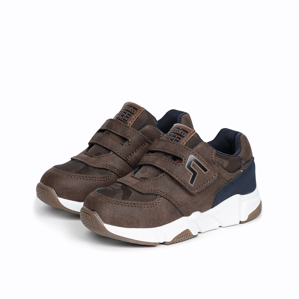 Практичные коричневые полуботинки с декоративными темно-синими элементами подойдут для мальчиков ясельного возраста и органично впишутся в их гардероб. Флокированная кожа придает обуви дорогой вид. Такой материал легок в уходе и долго сохраняет свою привлекательность.