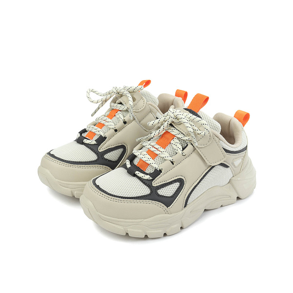 Эти современные и модные полуботинки типа кроссовки для мальчиков школьного возраста созданы, чтобы на них обращали внимание. У модели спортивный дизайн, выполненный в бежевом цвете с черными и оранжевыми декоративными элементами. Ботинки объемные, на высокой подошве. Оригинальные застежки сочетают в себе шнуровку и липучки.