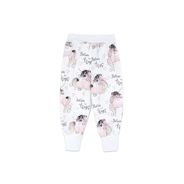 Мягкие и комфортные ползунки-трансформеры понравятся малышке своим сказочным дизайном. Ткань изделия усеяна розовыми единорогами и надписями. Ползунки сшиты из хлопкового трикотажа. Материал хорошо пропускает влагу и воздух, обеспечивая комфортную носку. Швы на ползунках тщательно прострочены, а эластичный пояс плотно облегает живот, но не сдавливает его. Низ штанин дополнен эластичными манжетами, они мягко прилегают к коже, не пропуская холодный воздух. При желании манжет легко превращается в закрытую ступню, чтобы ножкам было тепло и комфортно.