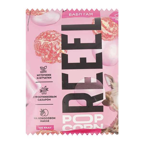 Попкорн «REEL» со вкусом жевательной резинки «Бабл гам» — это яркий и необычный перекус, который привлечет внимание детей своим вкусом и дизайном. Продукт представляет собой воздушные, хрустящие зерна кукурузы, покрытые сладкой глазурью с насыщенным ароматом жевательной резинки. Попкорн имеет приятный розовый оттенок.