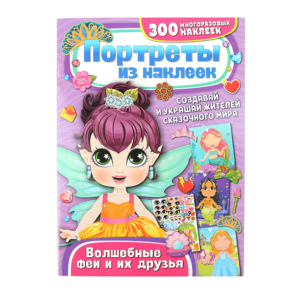 Книга «Портреты из наклеек» – это захватывающий набор для детского творчества, который позволяет создавать и украшать жителей сказочного мира. На обложке красуются волшебные феи и их друзья, которые приглашают в мир фантазии и мастерства.