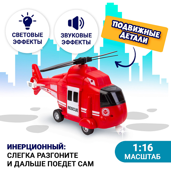Уменьшенная модель пожарного вертолета сохранила все пропорции оригинала, игрушка включает также дополнительное навесное оборудование, которое может понадобиться команде спасателей для грамотного и своевременного оказания помощи. Вертолет оборудован звуковой и световой сигнализацией, которая придает ему в игре детальную реалистичность. Такая игрушка понравится детям старше 3 лет и может использоваться для самостоятельных сюжетно-ролевых игр в компании друзей. Корпус вертолета изготовлен из прочного сертифицированного пластика, а несущие элементы укреплены металлическими деталями. Игрушка продается в красочной коробке с окном.
