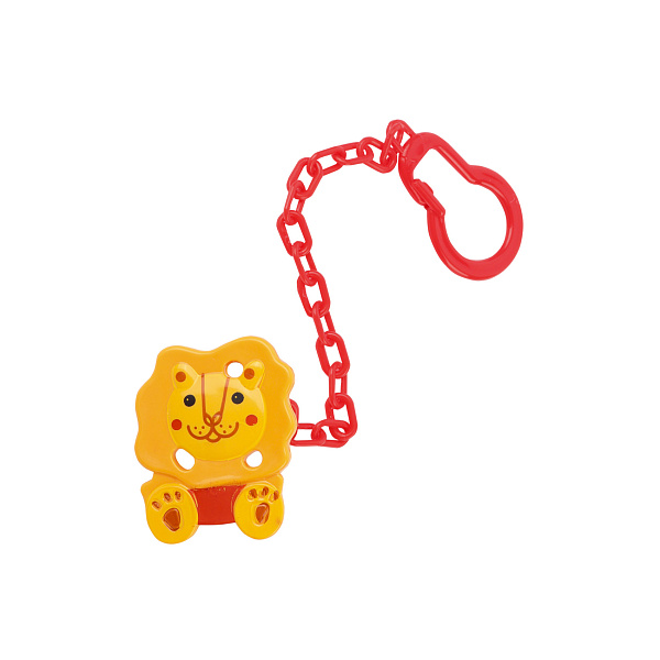 Изделие предназначено для удержания пустышек с кольцом. Оно состоит из пластиковой цепочки, к одному концу которой прикреплен держатель для пустышки, к другому – прищепка, закрепляемая на одежде малыша. Она выполнена в виде фигурки львенка. Яркий и красочный цвет изделия привлечет внимание малыша, вызовет у него положительные эмоции.