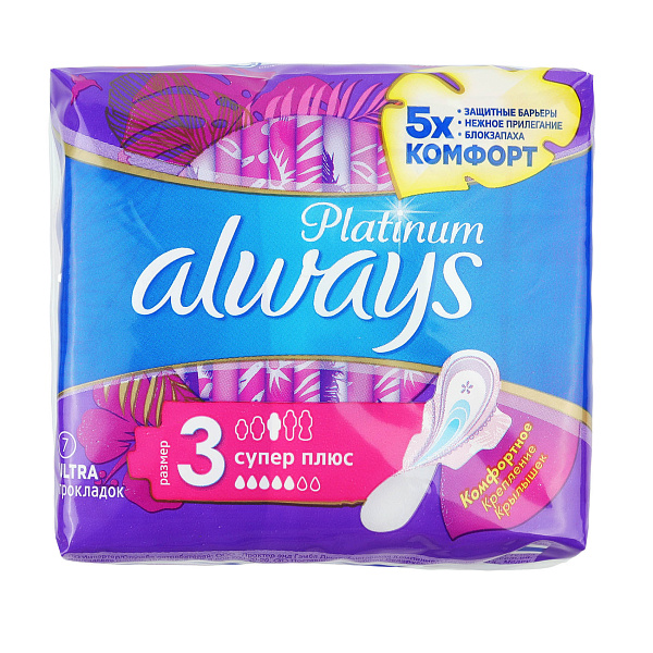 Прокладки ALWAYS Ultra Platinum Super Plus в количестве 7 штук обеспечивают комфорт и защиту. Ультратонкие, но вместе с тем оснащенные сильным поглощающим слоем, эти прокладки идеально подходят для дней, когда нужна надежная защита.