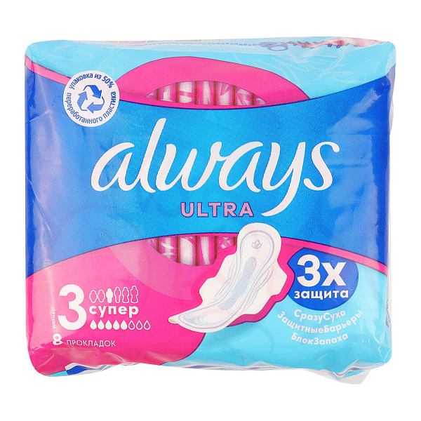 Гигиенические прокладки Always Ultra с крылышками гарантирует тройную защиту в течение всего дня. Прокладка за несколько секунд впитывает влагу и запирает ее внутри, предотвращая протекание и раздражение кожи. Технология «Блок запаха» нейтрализует неприятные запахи и сохраняет ощущение свежести. Крылышки надежно фиксируют прокладку не белье.