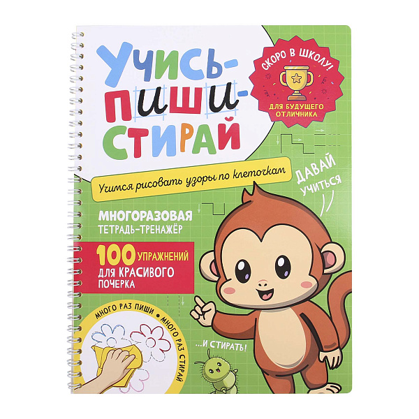 Многоразовые прописи пиши-стирай «Учимся рисовать узоры» с яркой обложкой и забавным дизайном помогает подготовить руку к письму. Тетрадь-тренажер включает 100 упражнений, направленных на развитие красивого почерка. Каждая страница ламинирована, что позволяет многократно использовать прописи, просто стирая написанное влажной салфеткой.