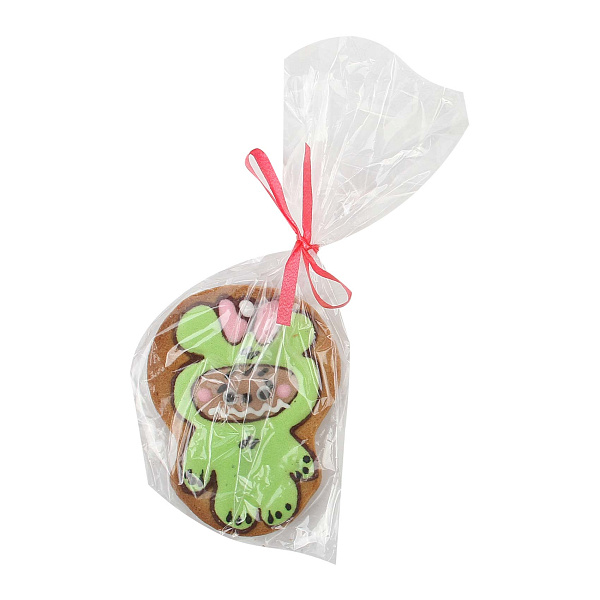 Изготовлен пряник из натуральных и безопасных ингредиентов, включая пшеничную муку, мед, сахар, сливочное масло и ароматные пряности. Состав не содержит вредных добавок и красителей, что обеспечивает высокое качество и безопасность продукта. Лакомство упаковано в прозрачный пакет с ленточкой, который сохраняет свежесть и насыщенный аромат до момента употребления.