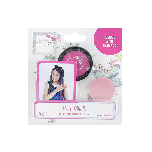 Продукт представляет собой пудру для окрашивания волос в оттенке фуксия. В комплект входит контейнер с пудрой и круглый аппликатор-губка для нанесения. Контейнер имеет прозрачную крышку, через которую виден насыщенный цвет пудры, а аппликатор выполнен в нежном розовом оттенке. Упаковка товара оформлена в светлых тонах с изображениями бабочек, она станет гармоничным дополнением к подарку девочке.