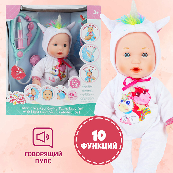 В комплекте с фигуркой поставляется набор доктора – стетоскоп, шприц, ложечка, а также соска-пустышка. Если пупсу дать соску, он будет забавно причмокивать, если ее отнять – начнет плакать настоящими слезами. Шприцем можно поставить кукле укол, стетоскопом послушать сердце, а ложечкой проверяется состояние горла. Манипуляции с куклой сопровождаются звуковыми эффектами.